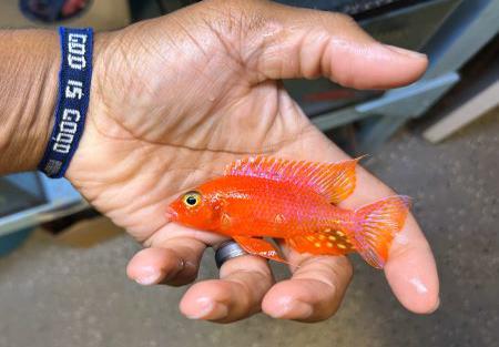The Fire Red Dragon Blood Peacock Cichlid is a vibrant and captivating freshwater fish, highly sought after by aquarium enthusiasts for its striking appearance and engaging behavior.