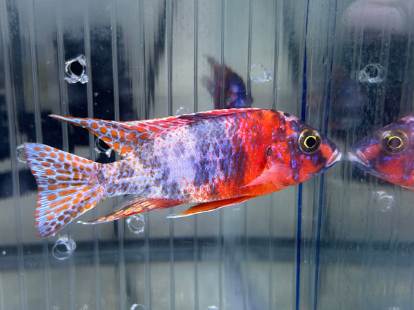The Red and Blue OB Peacock Cichlid's stunning appearance and engaging behavior make it a standout addition for cichlid enthusiasts seeking a vibrant and dynamic aquarium inhabitant.