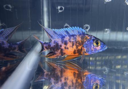 The Red and Blue OB Peacock Cichlid is a selectively bred hybrid from the Aulonocara genus, commonly known as Peacock Cichlids. This variant is distinguished by its vibrant red and blue coloration combined with the "Orange Blotch" (OB) pattern. The OB pattern introduces irregular blotches of color, resulting from crossbreeding male Aulonocara species with OB-patterned female Mbuna cichlids. This intentional hybridization aims to enhance the fish's aesthetic appeal.