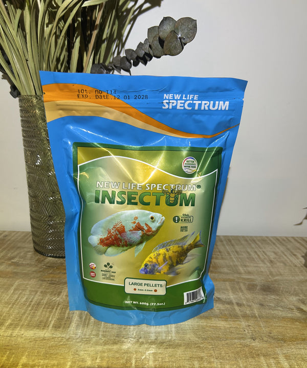 New Life Spectrum Insectum is a premium fish food formulated to closely mimic the natural insect-based diet of many fish species. It incorporates a diverse array of high-quality insect proteins, including mealworms, silkworm pupae, black soldier fly larvae, crickets, and grasshoppers.